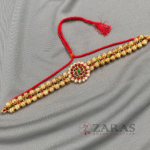 The above displayed is an Attigai from the exclusive collection of Zaras. With a two-line array of golden beads, big maroon kemp stones in between and connecting with a big kemp pendant with pearl hangings, this Golden beaded Attigai, stand out from other collections.