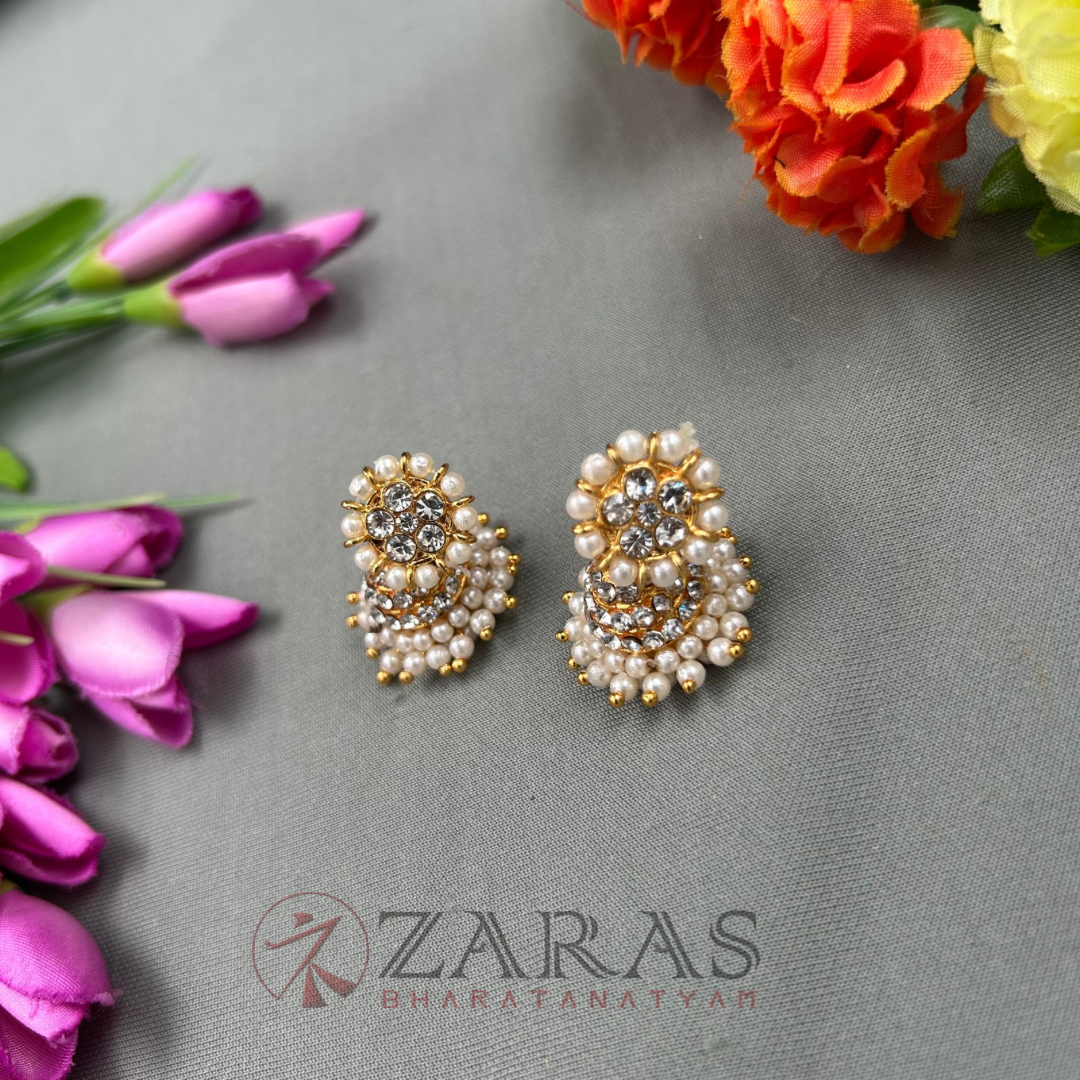 Earrings (thodu or kammal) are an integral part of a dance performance. From dance classes to the stage, a thodu accompanies the dancer. Despite the artform be it Bharatanatyam, Kuchipudi or Mohiniyattam, the style or design may change, but the Jhumka remains constant. Heavy earrings, mostly made with green and maroon kemp stones, white stones and pearls are being used, paired with medium-sized maati. Jhumkas are used widely. It increases the beauty of the dancer as well as the dance.