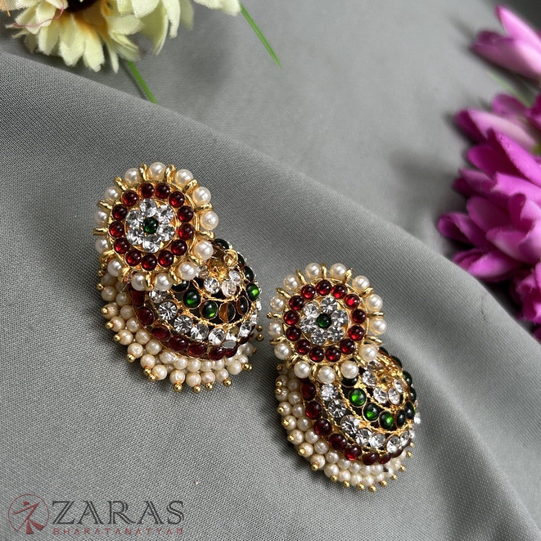 Heavy earrings, mostly made with green and maroon kemp stones, white stones and pearls are being used, paired with medium-sized maati. Jhumkas are used widely. It increases the beauty of the dancer as well as the dance.