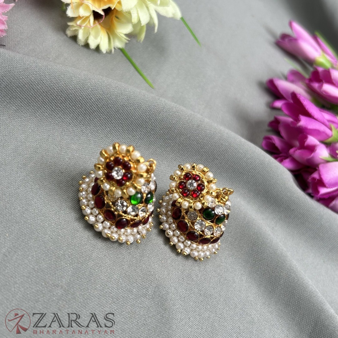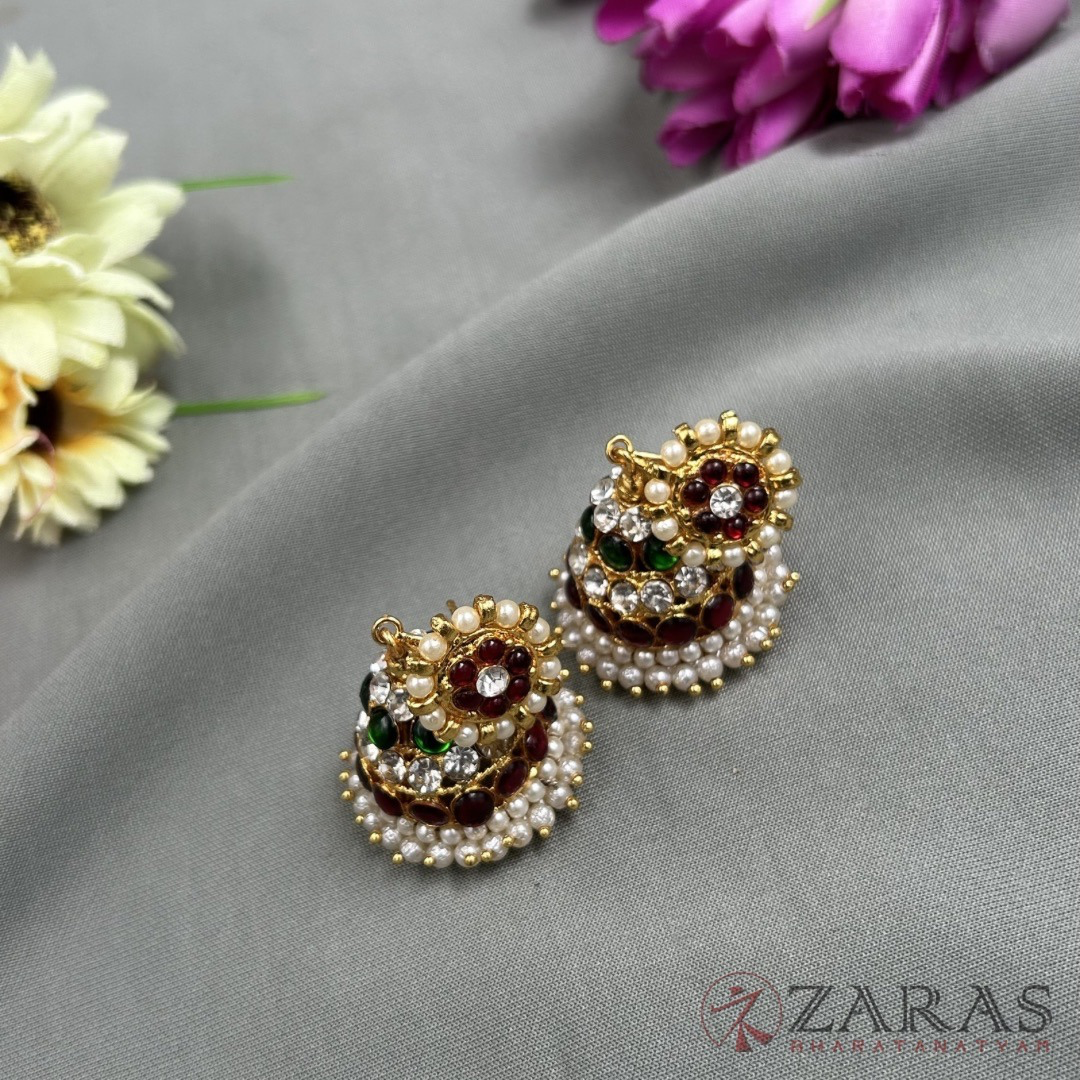 Heavy earrings, mostly made with green and maroon kemp stones, white stones and pearls are being used, paired with medium-sized maati. Jhumkas are used widely. It increases the beauty of the dancer as well as the dance.