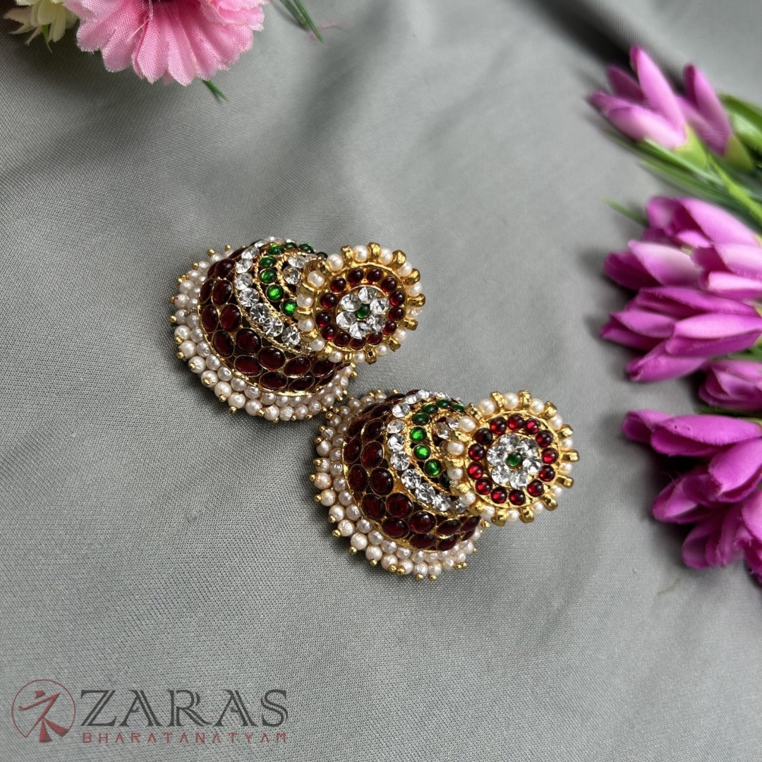 Heavy earrings, mostly made with green and maroon kemp stones, white stones and pearls are being used, paired with medium-sized maatal. Jhumkas are used widely. It increases the beauty of the dancer as well as the dance.