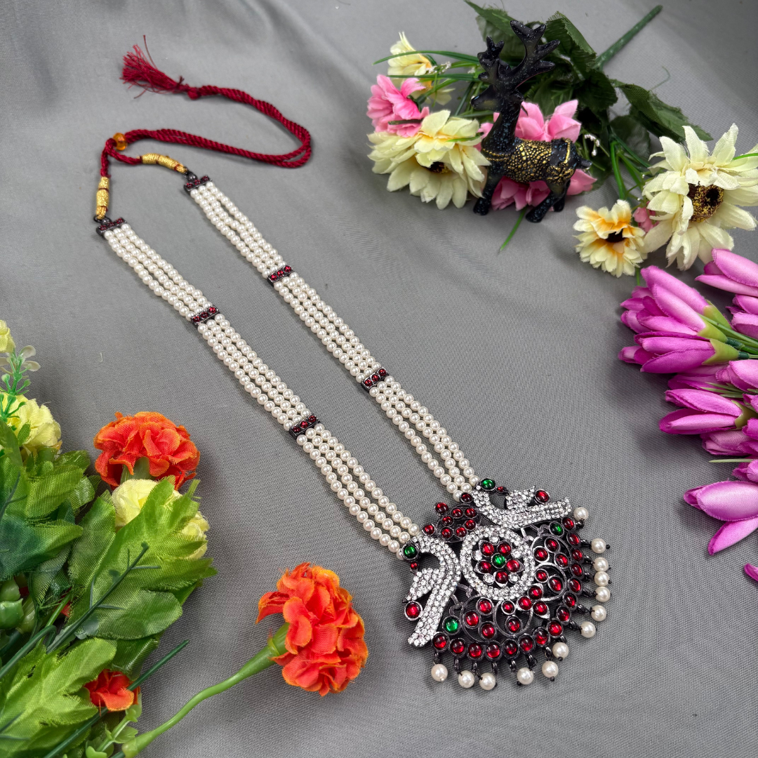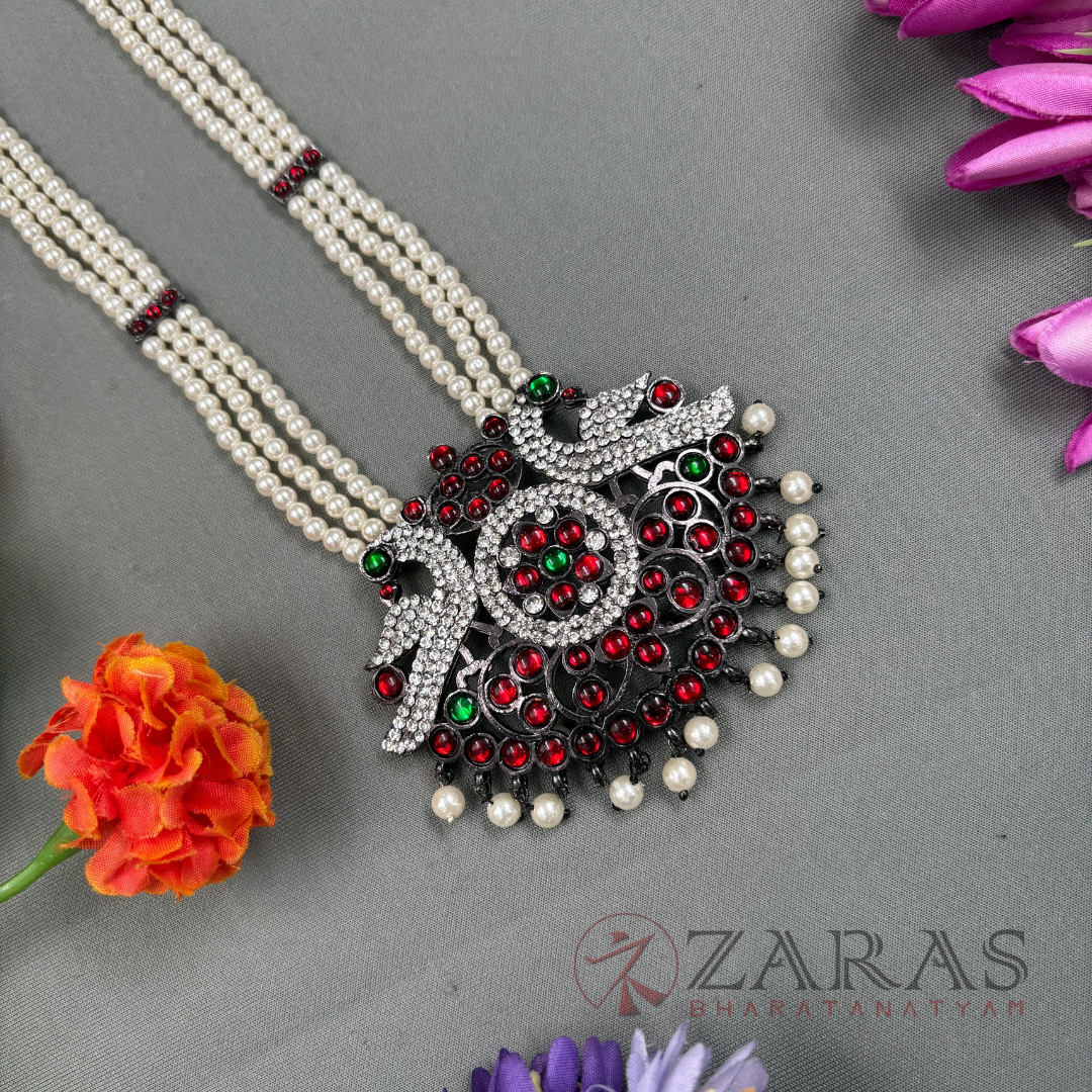 Neckpieces are the primary attraction in Bharatanatyam jewellery. The long malai, known as Haram, is an inevitable piece of adornment during performances. This is said to help dancers maintain their breathing during the performance.