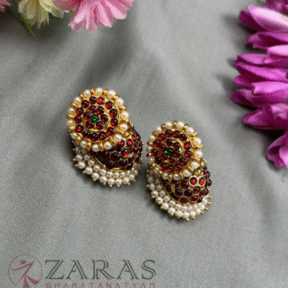 Earrings (thodu or kammal) are an integral part of a dance performance. From dance classes to the stage, a thodu accompanies the dancer. Despite the artform be it Bharatanatyam, Kuchipudi or Mohiniyattam, the style or design may change, but the Jhumka remains constant. Heavy earrings, mostly made with green and maroon kemp stones, white stones and pearls are being used, paired with medium-sized maati. Jhumkas are used widely. It increases the beauty of the dancer as well as the dance.