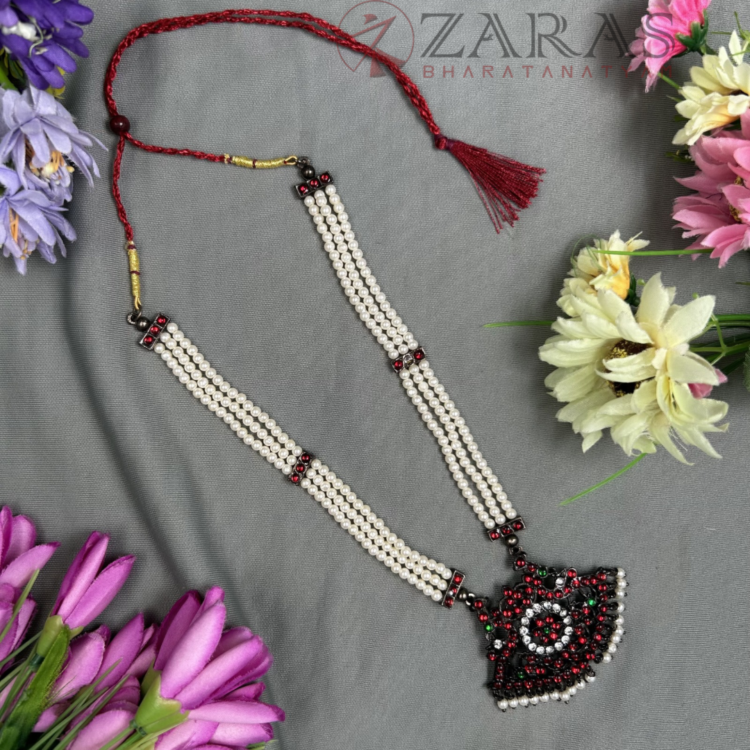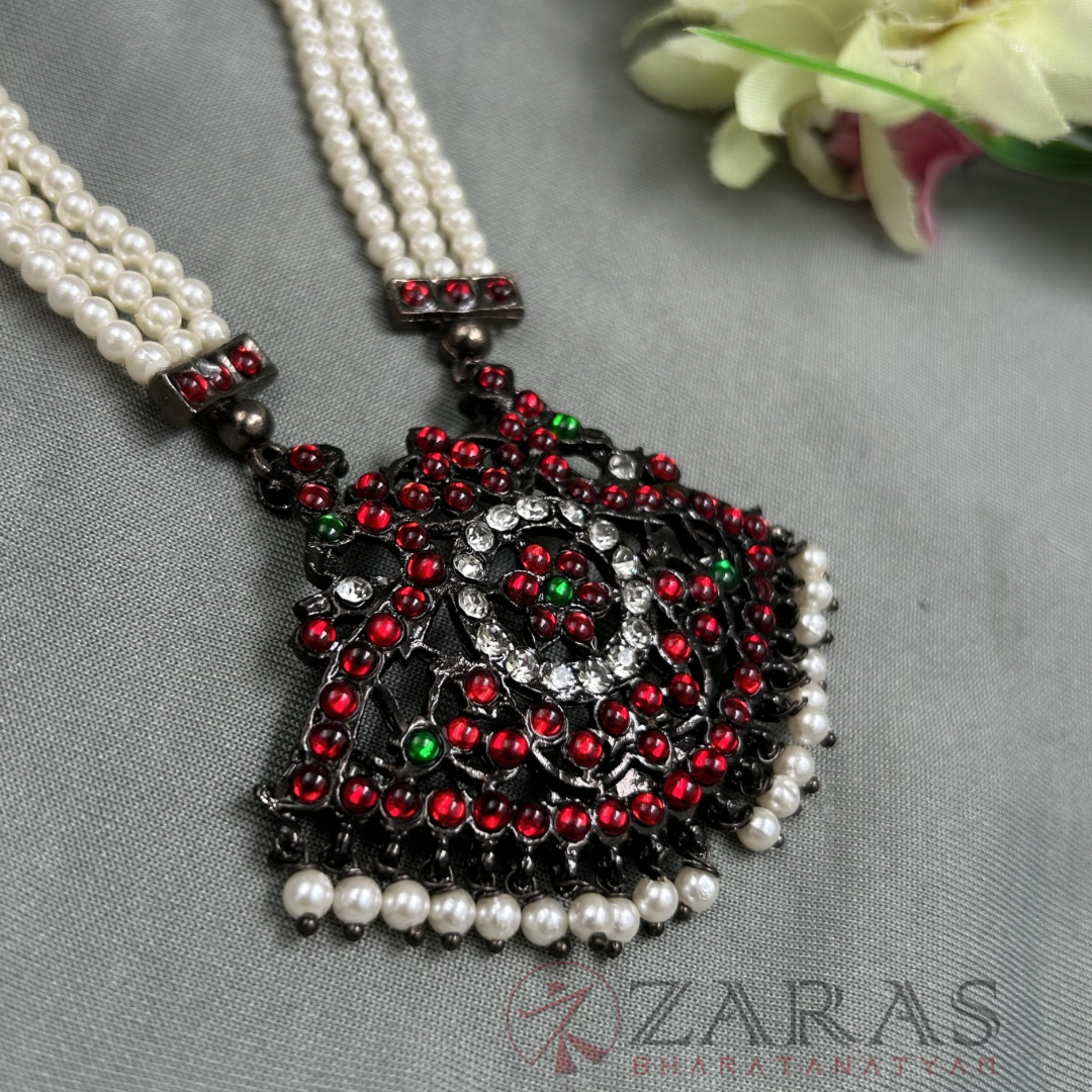 Neckpieces are the primary attraction in Bharatanatyam jewellery. The long malai, known as Haram, is an inevitable piece of adornment during performances. This is said to help dancers maintain their breathing during the performance.