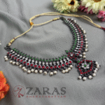 Zaras showcases an exclusive collection of attigais. Starting from Pearl attigais made with white pearls, green and maroon kemp stones and pendants of various shapes, to golden beaded attiagais which stand out from other collections and white and coloured stoned attiagi that shine out for heavy and intricate designs. The choker used for Mohiniyattam and Kuchipudi performances Alukkuthalis, is also available in various designs. The length can be adjusted with the help of attached extension threads.