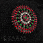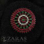 From simple elegant pieces to beautiful traditional pieces, Zaras has an absolutely stunning collection of Rakodi. The varieties include Goddess Lakshmi-inspired rakodi, layered with maroon and green kemp stones and white stones. An intricate carving of Goddess Lakshmi, sitting on the lotus, showing varada hasta and her devotees nearby, in golden foil is placed in the centre.