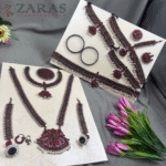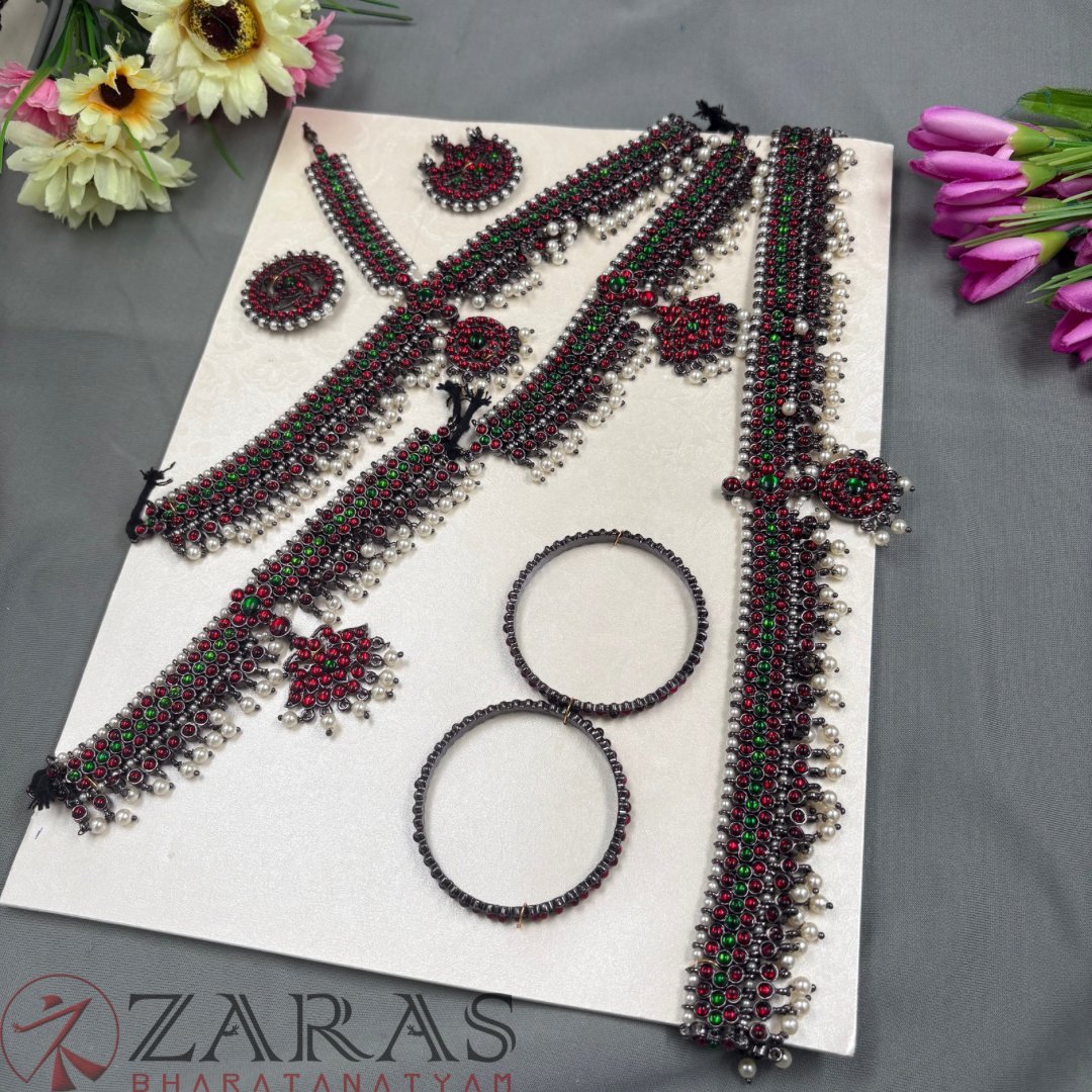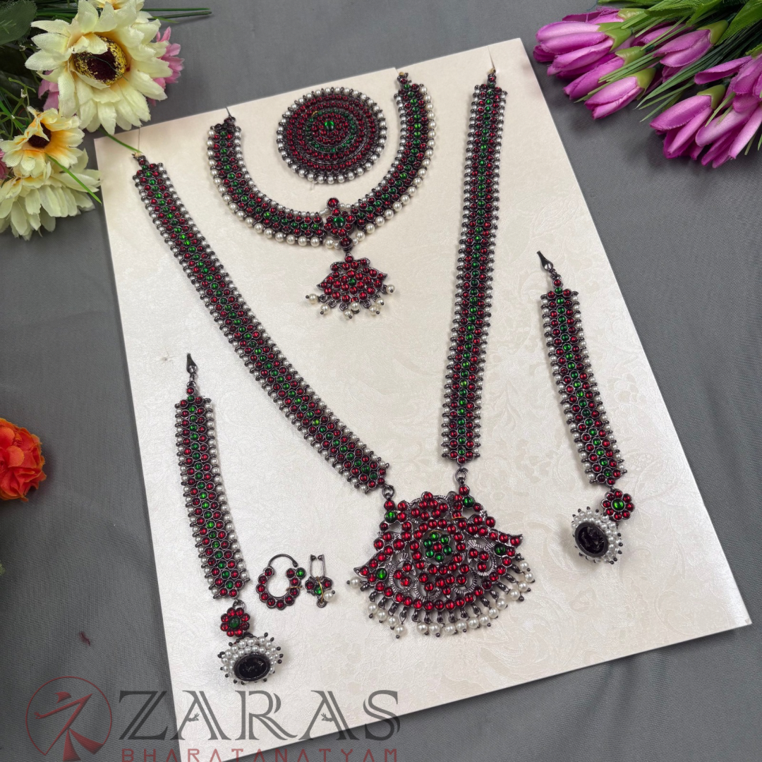 Neckpieces: The neckpieces consist of a short necklace and a long Malai, which are the focal points of the jewellery. The short necklace, known as Attikai, is worn just below the neck and is typically crafted with dark maroon and green stones. The long Malai is made of pearls and stones. It is believed to aid the dancer’s breathing during the performance.