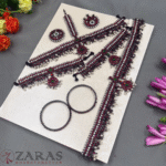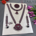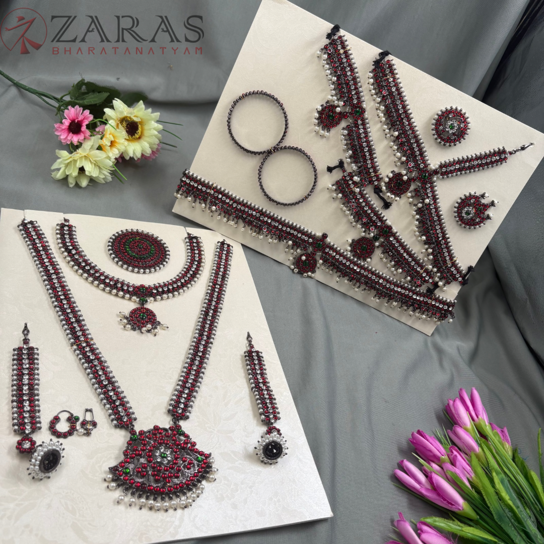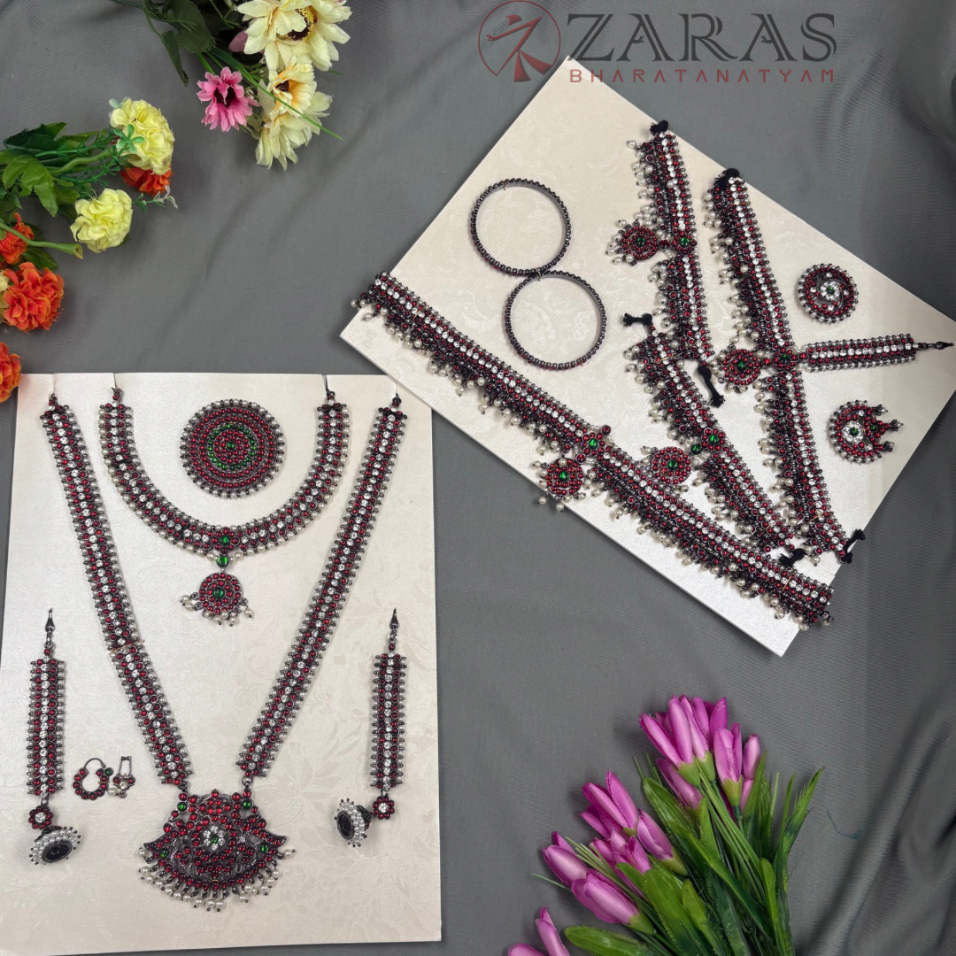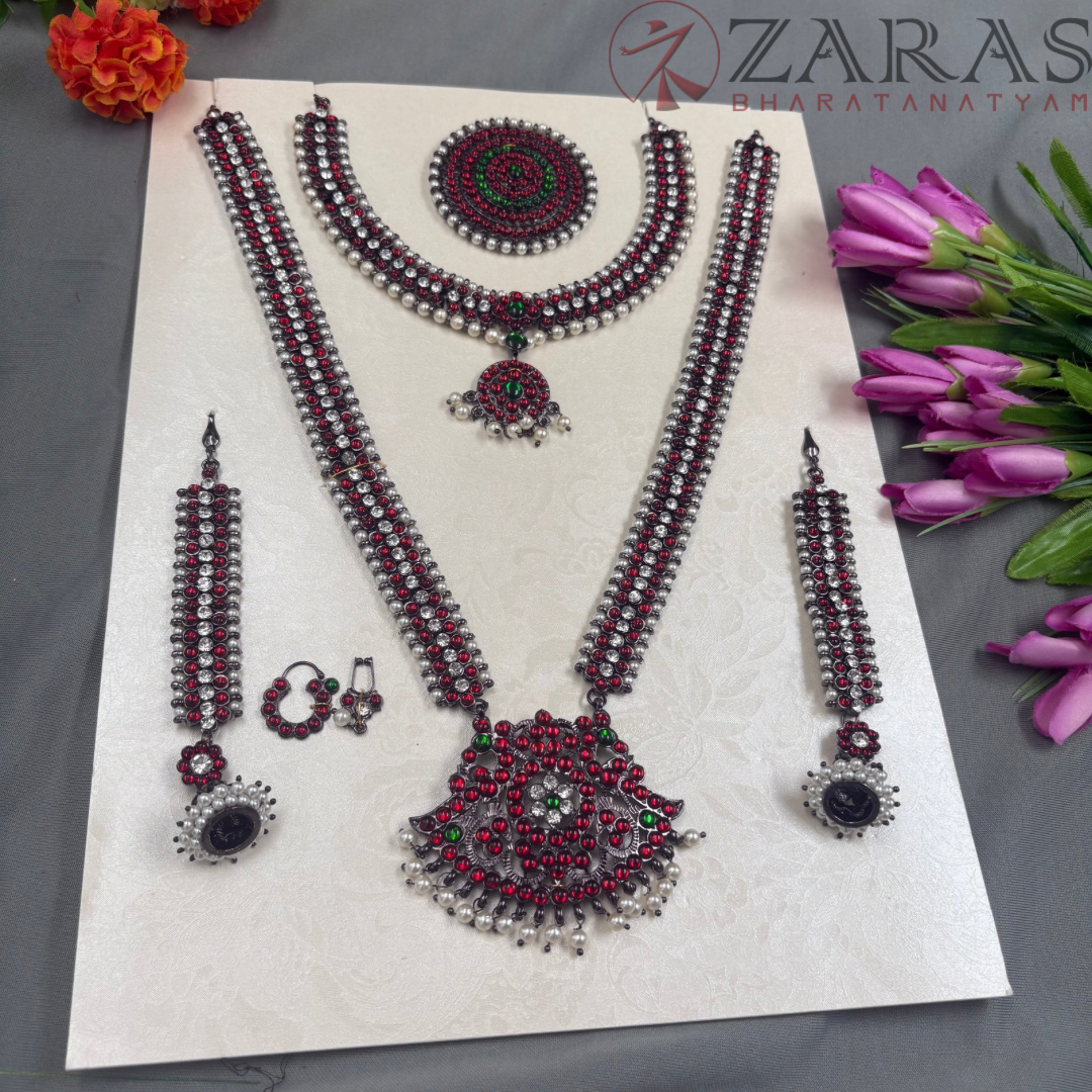Neckpieces: The neckpieces consist of a short necklace and a long Malai, which are the focal points of the jewellery. The short necklace, known as Attikai, is worn just below the neck and is typically crafted with dark maroon and green stones. The long Malai is made of pearls and stones. It is believed to aid the dancer’s breathing during the performance.