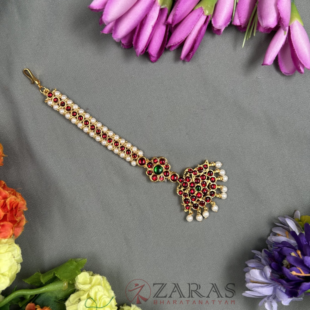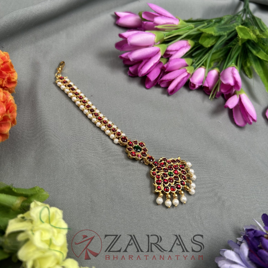 The head adornments used in Bharatanatyam have a beautiful array. The primary piece, Forehead jewellery or headset contains a long Nethi Chutti with a pendant and two brooches called Surya birai and Chandra birai depicting the sun and the moon, which is placed on either side of the head. They represent Lord Nataraja wearing the moon and stars as jewellery as told in the Dhyana Slokam.