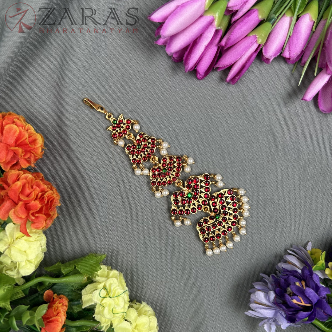 The head adornments used in Bharatanatyam have a beautiful array. The primary piece, Forehead jewellery or headset contains a long Nethi Chutti with a pendant and two brooches called Surya birai and Chandra birai depicting the sun and the moon, which is placed on either side of the head. They represent Lord Nataraja wearing the moon and stars as jewellery as told in the Dhyana Slokam.