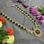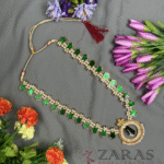 Zaras has a wide range of Haram collections starting from pearls to coloured stones, white stones and gold-plated harams. The pearl harams mostly come with a combination of white pearls, and maroon and green kemp stones. The pendant adorned with pearl hangings and unique designs filled with kemp stones is another rare touch. The harams designed with white and coloured stones, give a more royal look with its intricate designs and can be opted for stage performances while the popular pearl harams are a perfect choice for all kinds of stage performances as well as rehearsals, which allows dancers to dance with more confidence. The gold-plated harams are a perfect choice for Mohiniyattam. The length can be adjusted with the help of attached extension threads.