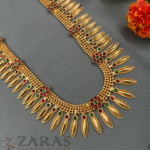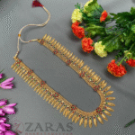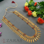Zaras has a wide range of Haram collections starting from pearls to coloured stones, white stones and gold-plated harams. The pearl harams mostly come with a combination of white pearls, and maroon and green kemp stones. The pendant adorned with pearl hangings and unique designs filled with kemp stones is another rare touch. The harams designed with white and coloured stones, give a more royal look with its intricate designs and can be opted for stage performances while the popular pearl harams are a perfect choice for all kinds of stage performances as well as rehearsals, which allows dancers to dance with more confidence. The gold-plated harams are a perfect choice for Mohiniyattam. The length can be adjusted with the help of attached extension threads.