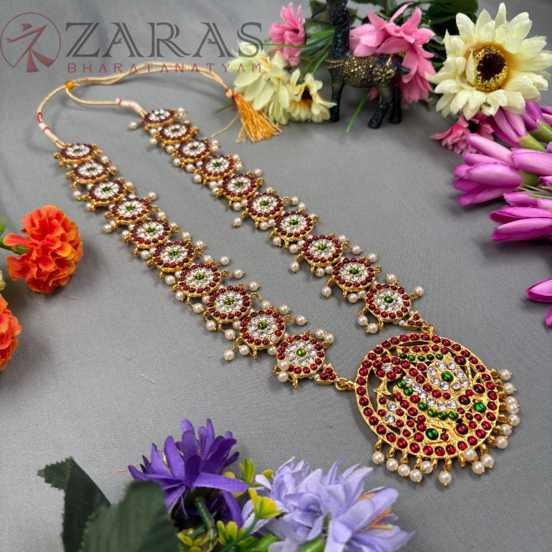 Neckpieces are the primary attraction in Bharatanatyam jewellery. The long malai, known as Haram, is an inevitable piece of adornment during performances. This is said to help dancers maintain their breathing during the performance.
