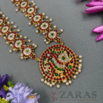 Zaras has a wide range of Haram collections starting from pearls to coloured stones, white stones and gold-plated harams. The pearl harams mostly come with a combination of white pearls, and maroon and green kemp stones. The pendant adorned with pearl hangings and unique designs filled with kemp stones is another rare touch. The harams designed with white and coloured stones, give a more royal look with its intricate designs and can be opted for stage performances while the popular pearl harams are a perfect choice for all kinds of stage performances as well as rehearsals, which allows dancers to dance with more confidence. The gold-plated harams are a perfect choice for Mohiniyattam. The length can be adjusted with the help of attached extension threads.