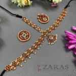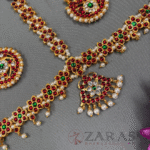 The above displayed is a high-on-demand Head Set, designed with a combination of pearls, maroon green kemp stones. It’s a broad Head Set covering the entire forehead. The array starts with small white pearls, followed by maroon kemp stones, and again a line of pearls, kemps and pearl hangings. The shaped pendant with a green kemp in the centre and surrounded with maroon kemps and pearl hangings enhance its beauty. The piece extends towards the partition and is 3 layered, with green stones in the middle and maroon kemps on either side.