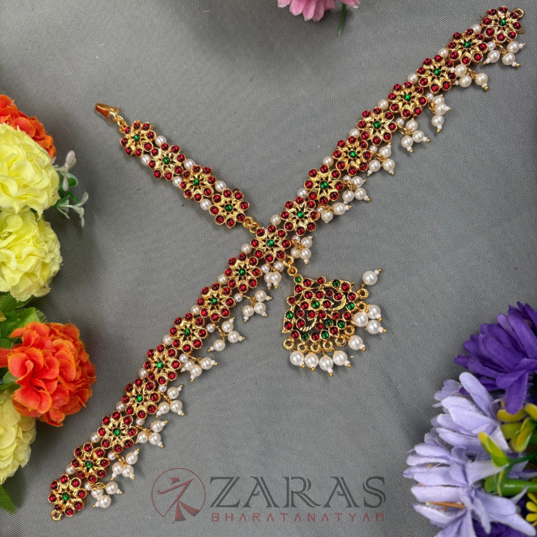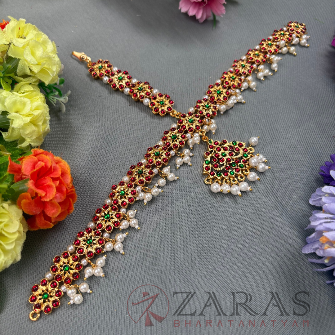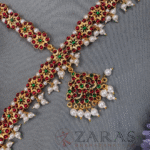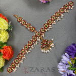 The above displayed is a high-on-demand Head Set, designed with a combination of pearls, maroon green kemp stones. It’s a broad Head Set covering the entire forehead. The array starts with small white pearls, followed by maroon kemp stones, and again a line of pearls, kemps and pearl hangings. The shaped pendant with a green kemp in the centre and surrounded with maroon kemps and pearl hangings enhance its beauty. The piece extends towards the partition and is 3 layered, with green stones in the middle and maroon kemps on either side.