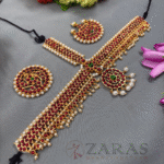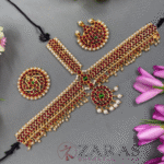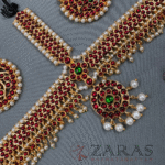 The above displayed is a high-on-demand Head Set, designed with a combination of pearls, maroon green kemp stones. It’s a broad Head Set covering the entire forehead. The array starts with small white pearls, followed by maroon kemp stones, and again a line of pearls, kemps and pearl hangings. The shaped pendant with a green kemp in the centre and surrounded with maroon kemps and pearl hangings enhance its beauty. The piece extends towards the partition and is 3 layered, with green stones in the middle and maroon kemps on either side.