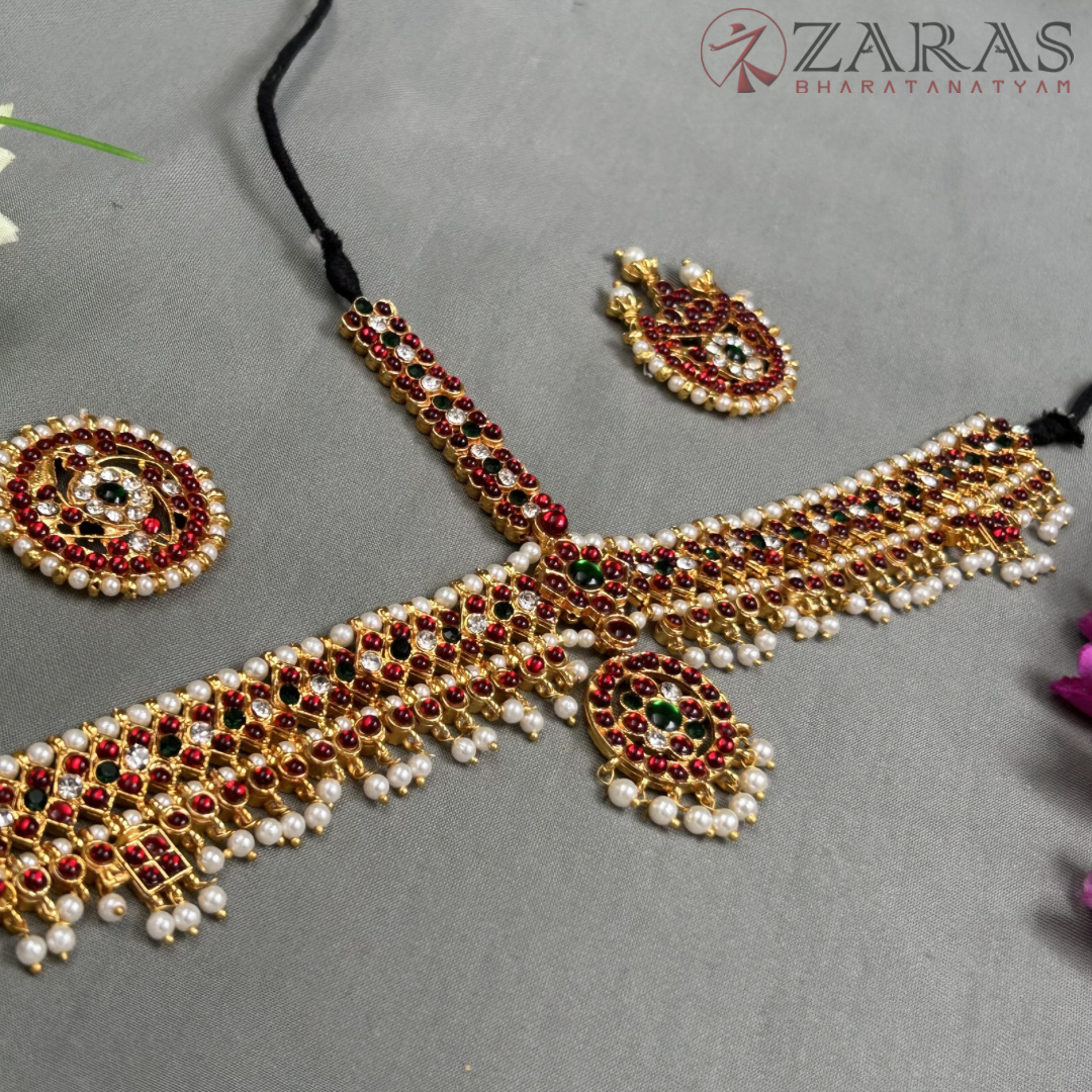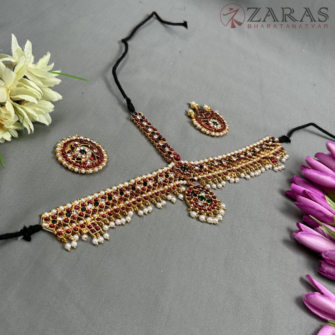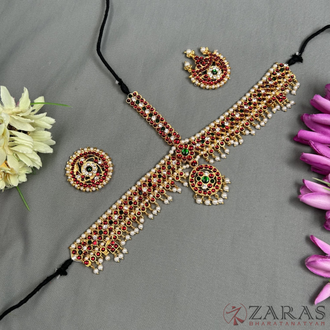 Bharatanatyam features an exquisite array of head adornments. The principal part, Forehead jewellery or headset, consists of a long Nethi Chutti with a pendant and two brooches called Surya birai and Chandra birai, which portray the sun and moon and are worn on either side of the head. They depict Lord Nataraja wearing the moon and stars as jewels, as described in the Dhyana Slokam of Abinayadarpnam by Nandhikeshwara.