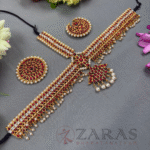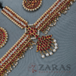The above displayed is a high-on-demand Head Set, designed with a combination of pearls, maroon green kemp stones. It’s a broad Head Set covering the entire forehead. The array starts with small white pearls, followed by maroon kemp stones, and again a line of pearls, kemps and pearl hangings. The shaped pendant with a green kemp in the centre and surrounded with maroon kemps and pearl hangings enhance its beauty. The piece extends towards the partition and is 3 layered, with green stones in the middle and maroon kemps on either side.