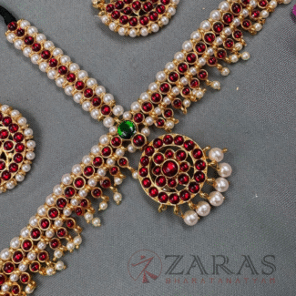 The above displayed is a high-on-demand Head Set, designed with a combination of pearls, maroon green kemp stones. It’s a broad Head Set covering the entire forehead. The array starts with small white pearls, followed by maroon kemp stones, and again a line of pearls, kemps and pearl hangings. The shaped pendant with a green kemp in the centre and surrounded with maroon kemps and pearl hangings enhance its beauty. The piece extends towards the partition and is 3 layered, with green stones in the middle and maroon kemps on either side.