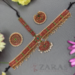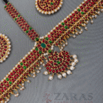 The above displayed is a high-on-demand Head Set, designed with a combination of pearls, maroon green kemp stones. It’s a broad Head Set covering the entire forehead. The array starts with small white pearls, followed by maroon kemp stones, and again a line of pearls, kemps and pearl hangings. The shaped pendant with a green kemp in the centre and surrounded with maroon kemps and pearl hangings enhance its beauty. The piece extends towards the partition and is 3 layered, with green stones in the middle and maroon kemps on either side.