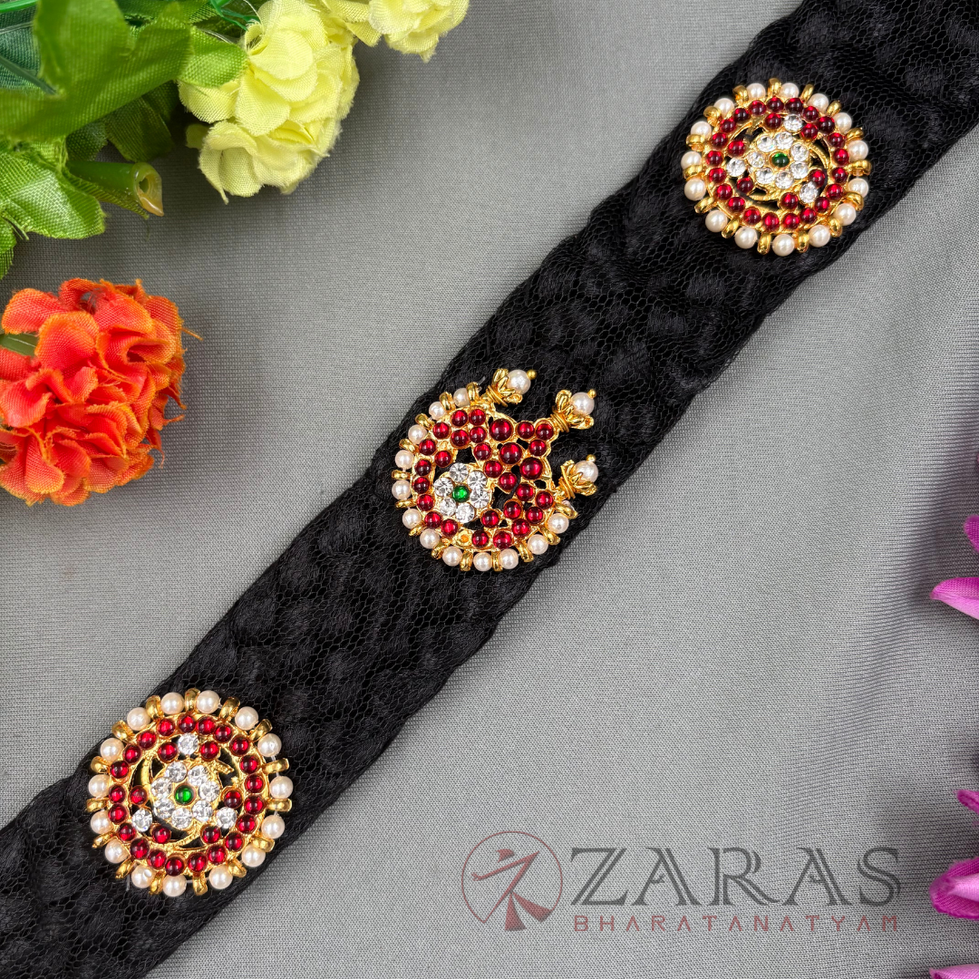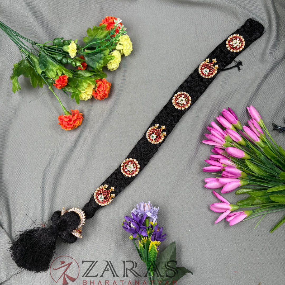 The Jadai Set is used in both Bharatanatyam and Kuchipudi. Traditionally, dancers adorned their hair with flowers, but today, the Jadai Set has largely replaced this practice, although Jasmine and Kadambham flowers continue to be popular choices for hair decoration. The Jadai set is a crucial element in Bharatanatyam, playing both an aesthetic and symbolic role in the dance. Jadai set which is made of stone or gold plated is kept along the length of the hair.