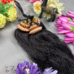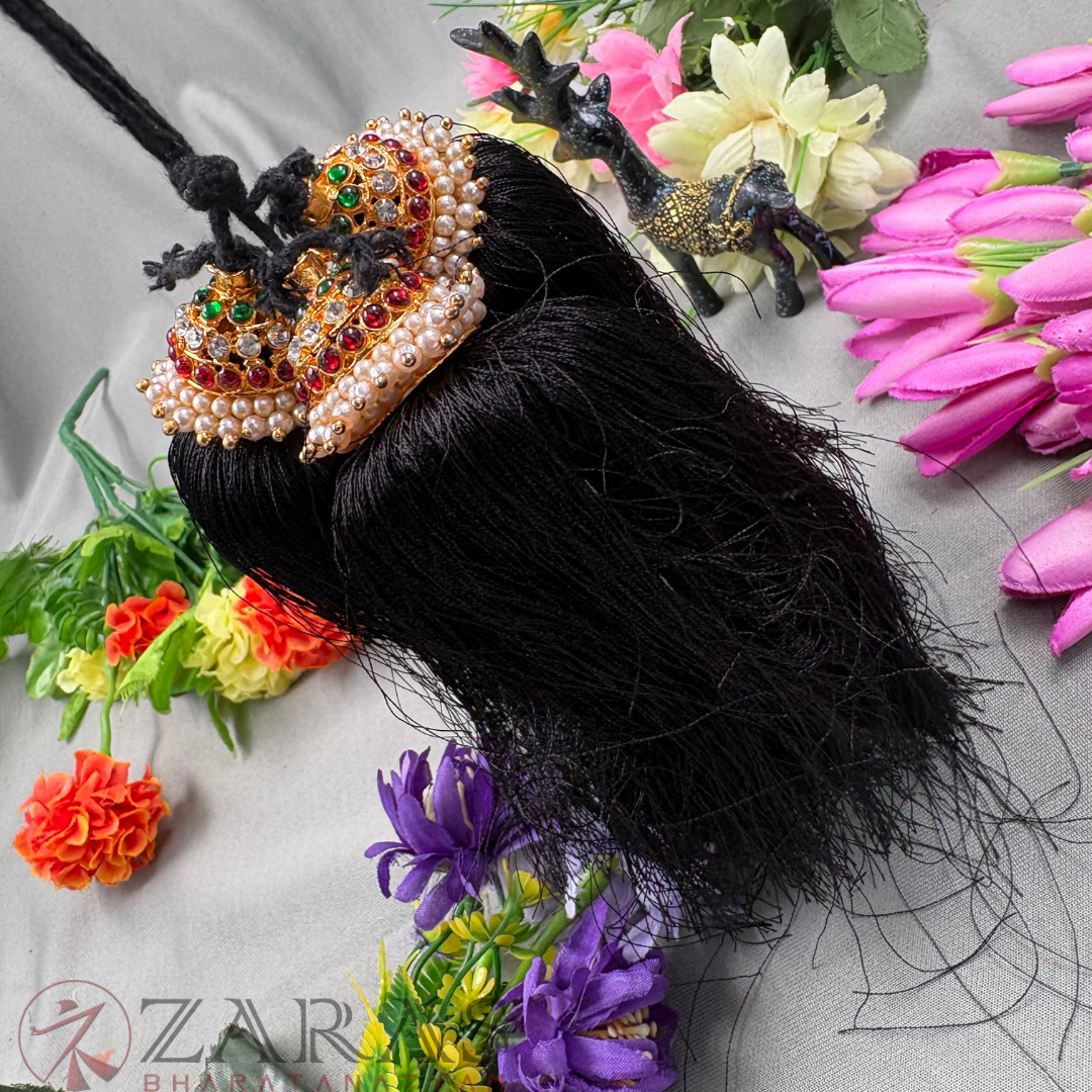 In Bharatanatyam, the Kunjalam is a traditional hair accessory that plays a significant role in enhancing the dancer’s aesthetic appeal, cultural expression, and overall grace. Adorned with pearls, stones, and intricate designs, the Kunjalam adds an elegant touch to the dancer’s hairstyle, completing the visual presentation. It holds cultural importance, symbolizing femininity, grace, and prosperity within South Indian tradition.