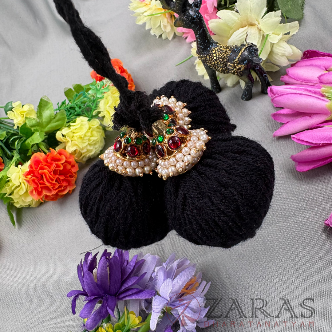 In Bharatanatyam, the Kunjalam is a traditional hair accessory that plays a significant role in enhancing the dancer’s aesthetic appeal, cultural expression, and overall grace. Adorned with pearls, stones, and intricate designs, the Kunjalam adds an elegant touch to the dancer’s hairstyle, completing the visual presentation. It holds cultural importance, symbolizing femininity, grace, and prosperity within South Indian tradition.