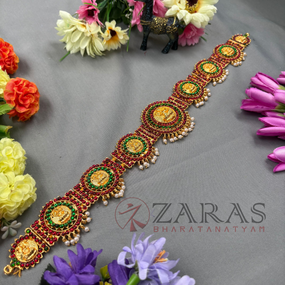 The waist chain known as Ottiyanam is a beautiful ornament worn at the waist of the dancers. It would be gold plated or with stone works. Some intricate designs or sculptures of the god would be carved in the middle of it. Ottiyanam or hip belts make the hip and waist movements more visible.