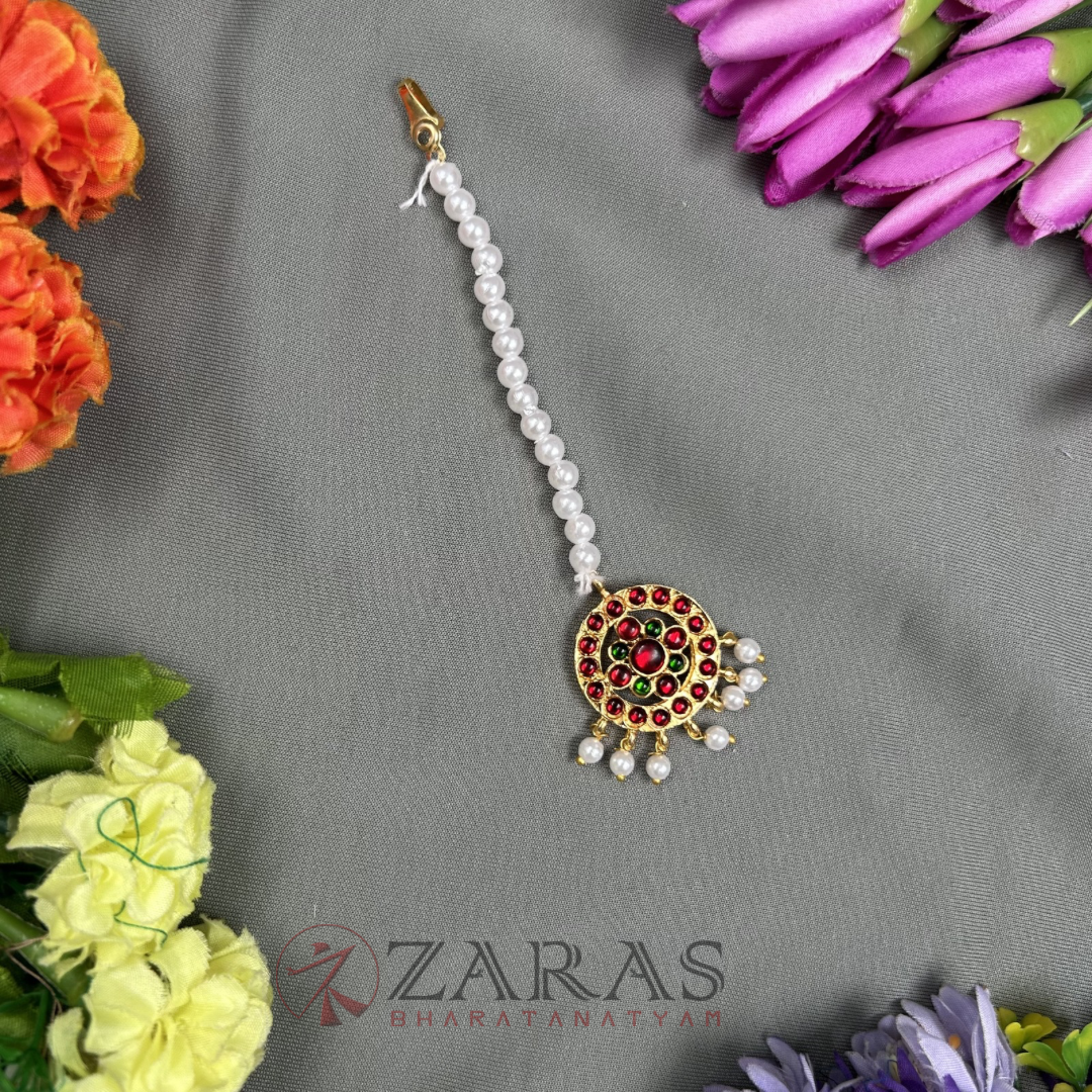 The head adornments used in Bharatanatyam have a beautiful array. The primary piece, Forehead jewellery or headset contains a long Nethi Chutti with a pendant and two brooches called Surya birai and Chandra birai depicting the sun and the moon, which is placed on either side of the head. They represent Lord Nataraja wearing the moon and stars as jewellery as told in the Dhyana Slokam.