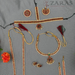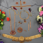 Head Jewelry: The forehead jewellery, also known as the Nethi Chutti, features a long pendant and two brooches called Surya Birai and Chandra Birai, representing the sun and moon. These are placed on either side of the head.