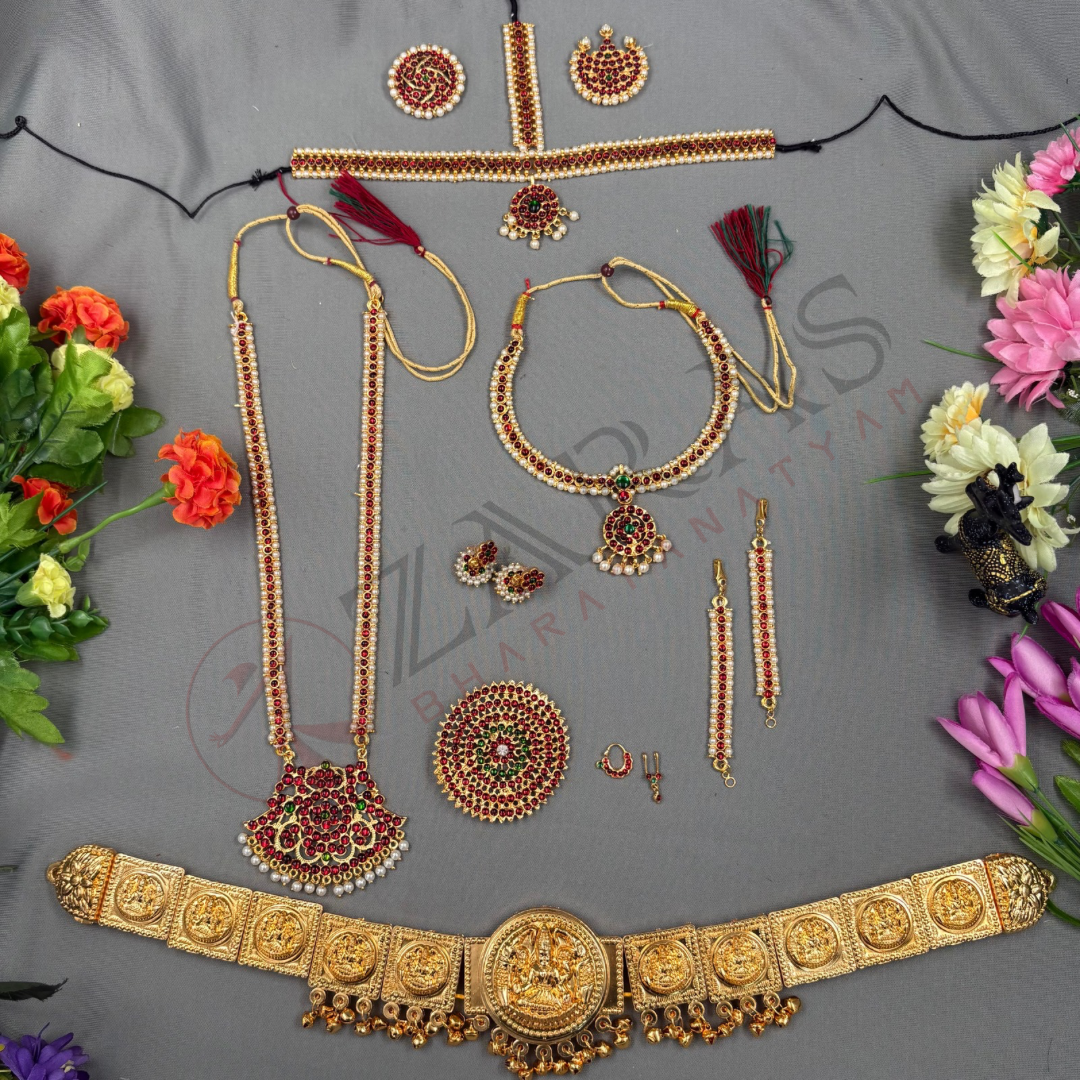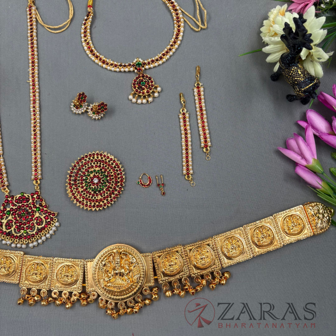 Waist Chain: The Ottiyanam is a decorative waist chain worn by dancers. It is usually gold-plated or adorned with stonework. Sculptures of deities are often carved in its centre. This ornament emphasizes the dancer’s waist and hip movements.