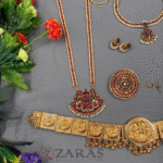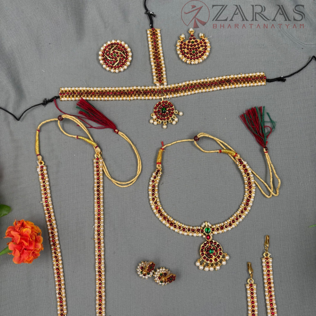 Neckpieces: The neckpieces consist of a short necklace and a long Malai, which are the focal points of the jewellery. The short necklace, known as Attikai, is worn just below the neck and is typically crafted with dark maroon and green stones. The long Malai is made of pearls and stones. It is believed to aid the dancer’s breathing during the performance.