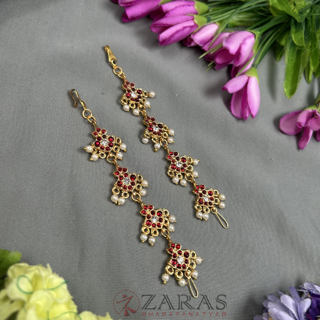 Mattal is a rectangular-shaped adornment composed of pearls and kemp stones. Female dancers attach it to their jhumkas and wear it as a head adornment. It enhances the attractiveness of the thodu (jhumka), provides grip, and also adds beauty to the headset.