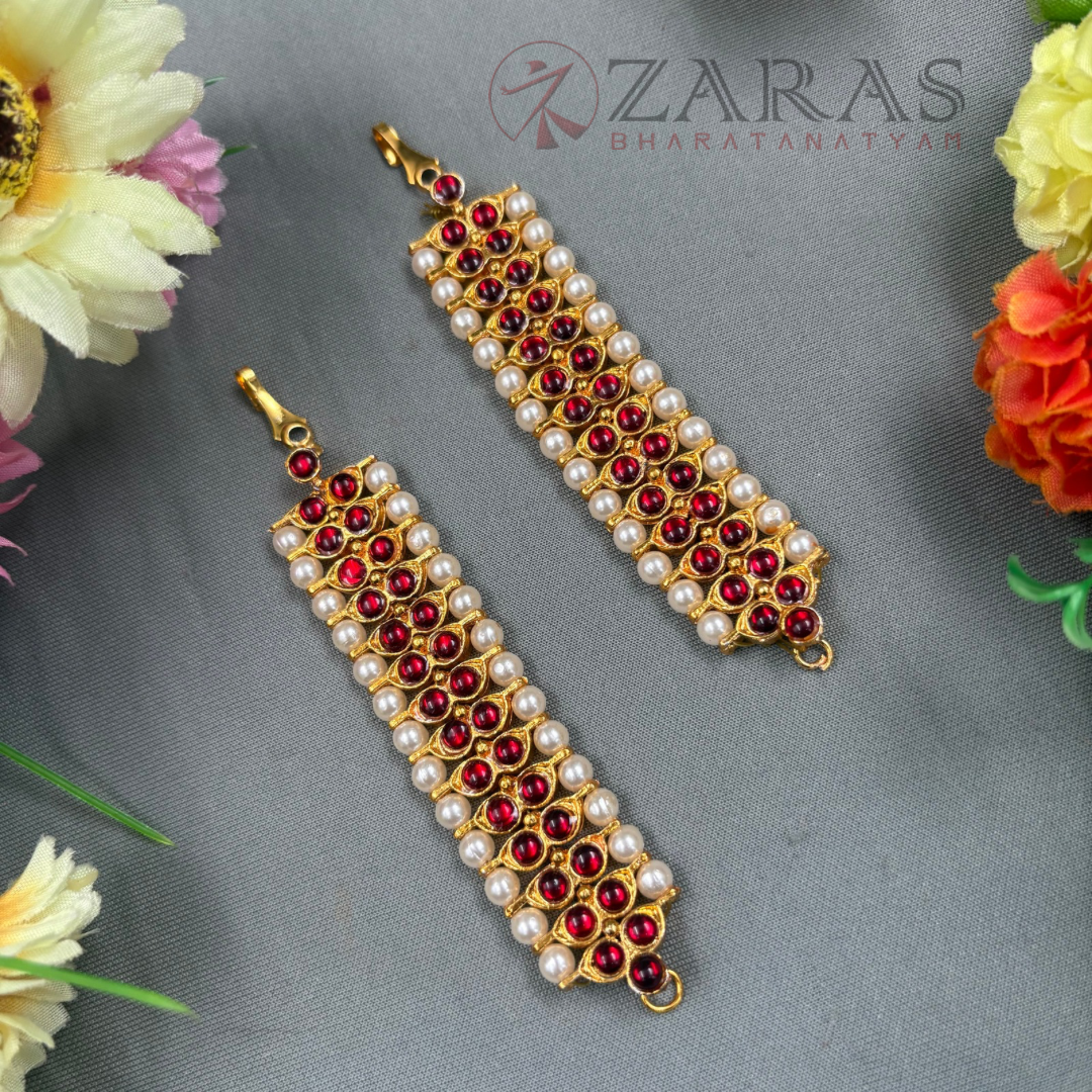 Zaras has an array of Mattal collections. Starting from traditional designs, made with an array of green and maroon kemp stones and pearls, with a golden base, presenting an aesthetic look, mattals with the alignment of white stones in the centre and maroon kemp stones and pearls on either side, small-sized mattals suitable for dancers below the age of 10- 12 and various other collections.