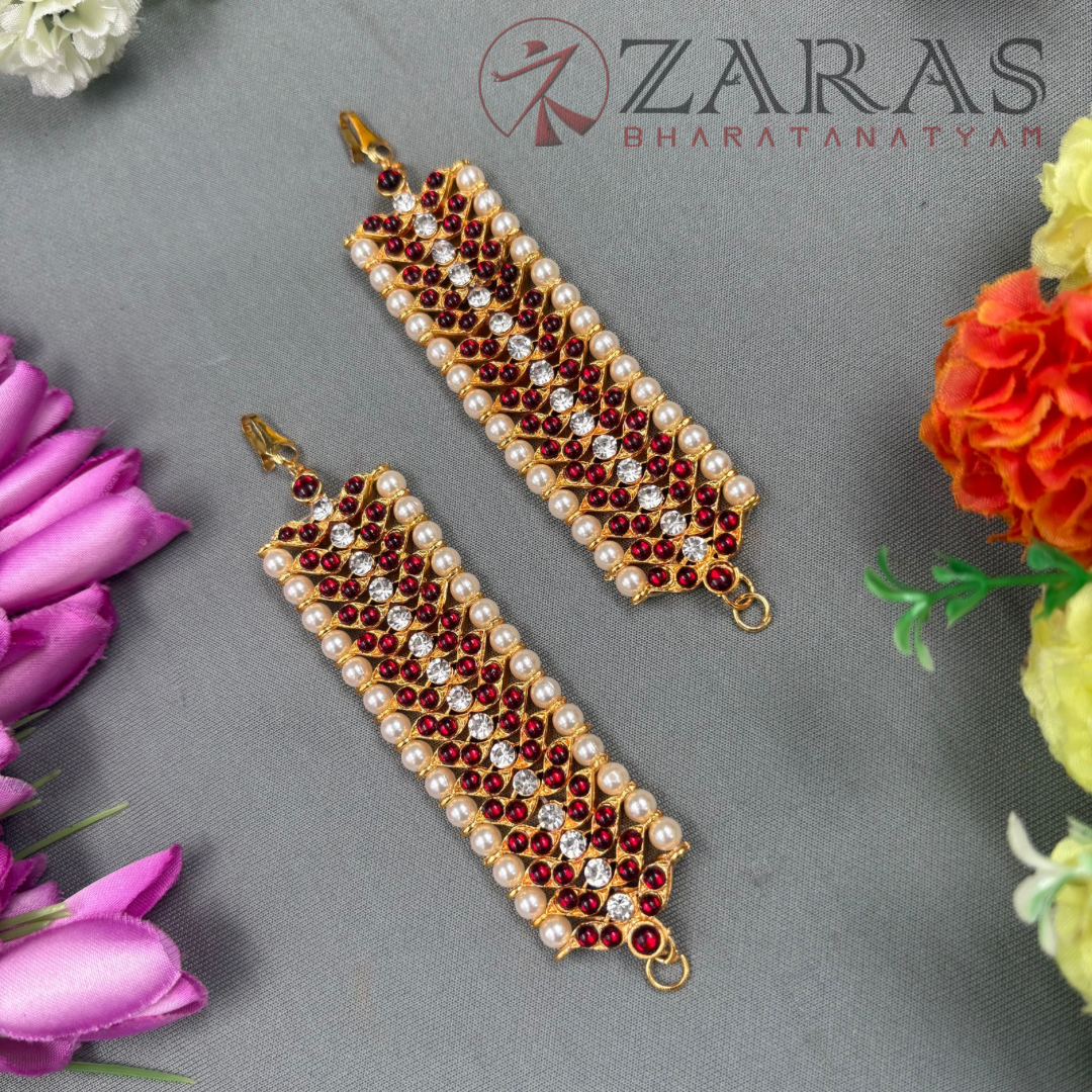 Mattal is a rectangular-shaped adornment composed of pearls and kemp stones. Female dancers attach it to their jhumkas and wear it as a head adornment. It enhances the attractiveness of the thodu (jhumka), provides grip, and also adds beauty to the headset.