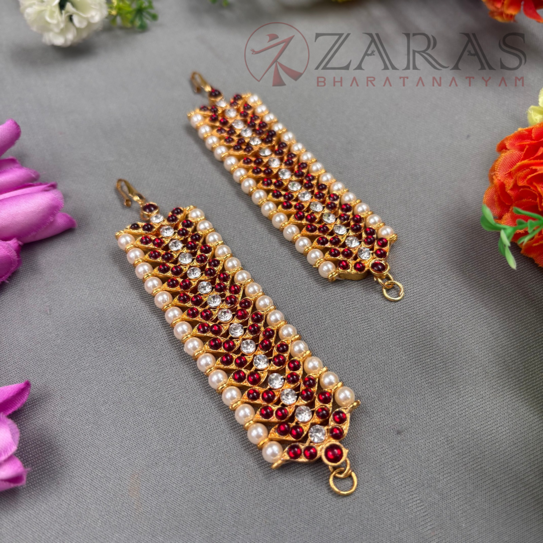 Zaras has an array of Mattal collections. Starting from traditional designs, made with an array of green and maroon kemp stones and pearls, with a golden base, presenting an aesthetic look, mattals with the alignment of white stones in the centre and maroon kemp stones and pearls on either side, small-sized mattals suitable for dancers below the age of 10- 12 and various other collections.