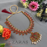 Zaras showcases an exclusive collection of attigais. Starting from Pearl attigais made with white pearls, green and maroon kemp stones and pendants of various shapes, to golden beaded attiagais which stand out from other collections and white and coloured stoned attiagi that shine out for heavy and intricate designs. The choker used for Mohiniyattam and Kuchipudi performances Alukkuthalis, is also available in various designs. The length can be adjusted with the help of attached extension threads.