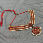 The above displayed is an Attigai from the exclusive collection of Zaras. With a two-line array of golden beads, big maroon kemp stones in between and connecting with a big kemp pendant with pearl hangings, this Golden beaded Attigai, stand out from other collections.