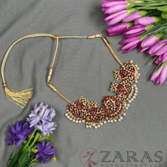 The above displayed is an Attigai from the exclusive collection of Zaras. With a two-line array of golden beads, big maroon kemp stones in between and connecting with a big kemp pendant with pearl hangings, this Golden beaded Attigai, stand out from other collections.