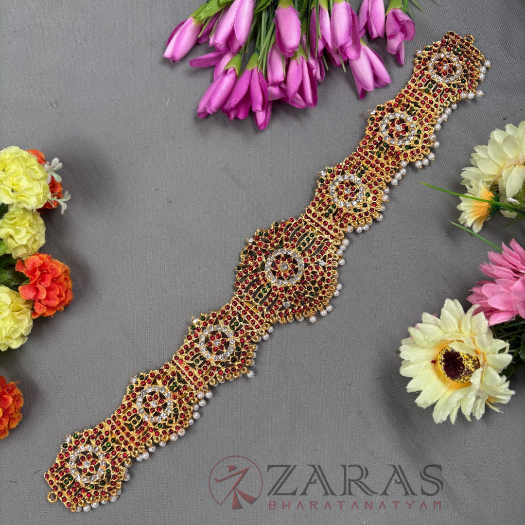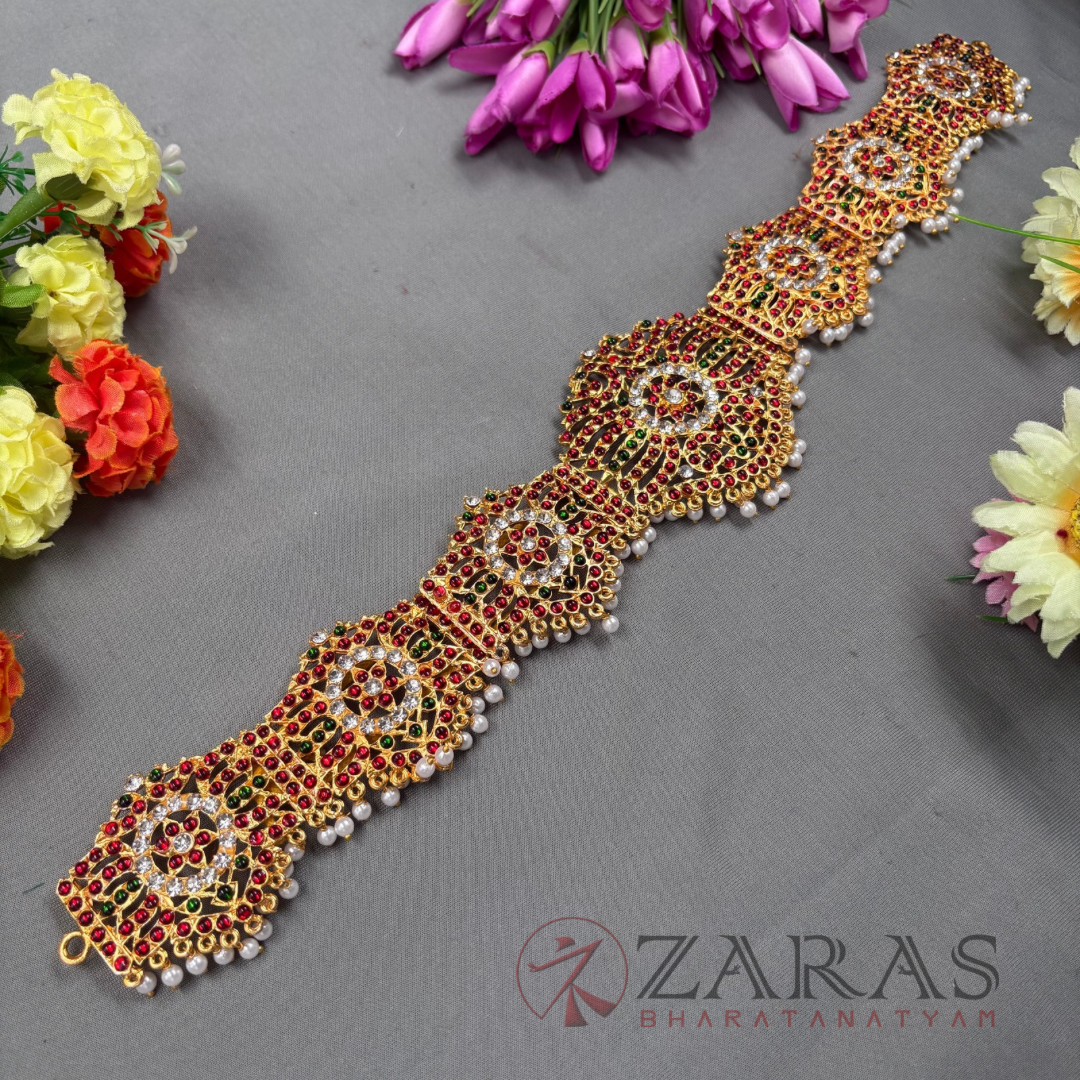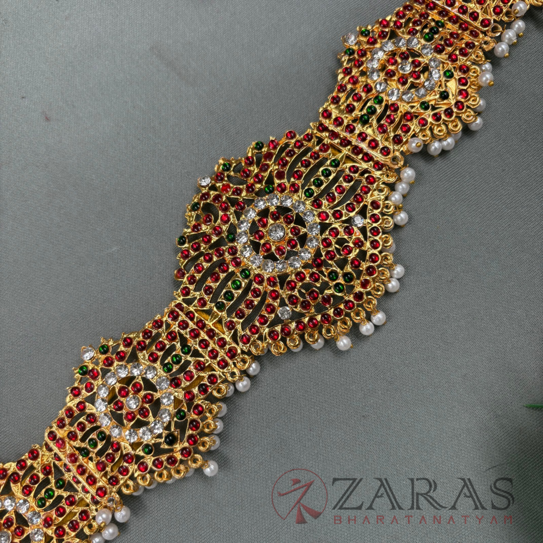 Zaras offers an exclusive collection of Ottiyanams. Kemp Ottiyanams are made with green and maroon kemp stones, white stones and pearl hangings, Ottiyanams are designed with pure white stones as well as coloured stones with intricate designs, Gold plated ottiyanams which are perfect for male dancers and many more unique designs are available. The length is designed accordingly and is suitable for all age groups, also can be adjusted according to the waist size.