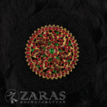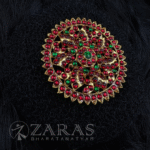 From simple elegant pieces to beautiful traditional pieces, Zaras has an absolutely stunning collection of Rakodi. The varieties include Goddess Lakshmi-inspired rakodi, layered with maroon and green kemp stones and white stones. An intricate carving of Goddess Lakshmi, sitting on the lotus, showing varada hasta and her devotees nearby, in golden foil is placed in the centre.