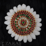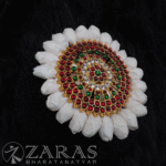 From simple elegant pieces to beautiful traditional pieces, Zaras has an absolutely stunning collection of Rakodi. The varieties include Goddess Lakshmi-inspired rakodi, layered with maroon and green kemp stones and white stones. An intricate carving of Goddess Lakshmi, sitting on the lotus, showing varada hasta and her devotees nearby, in golden foil is placed in the centre.
