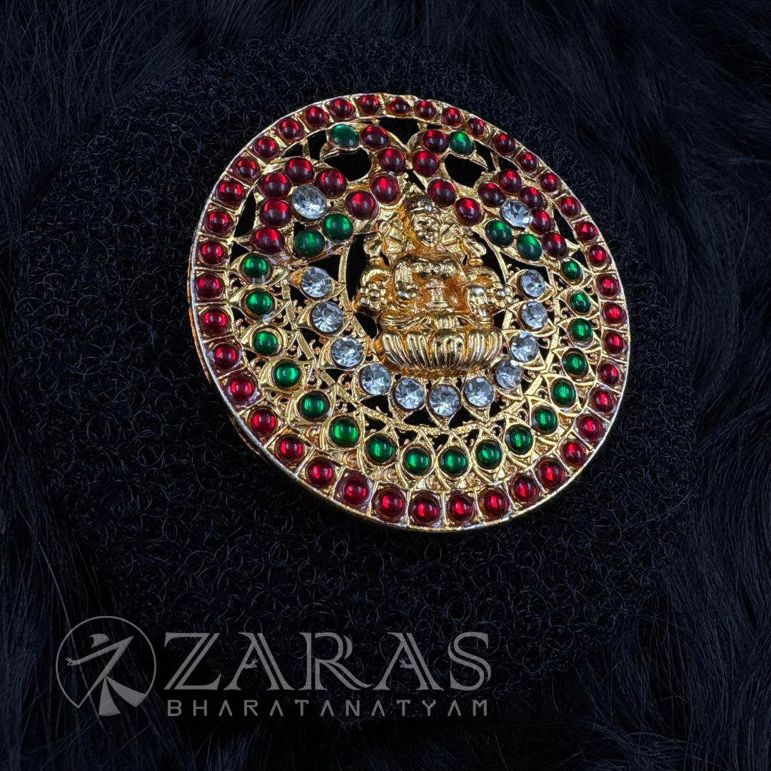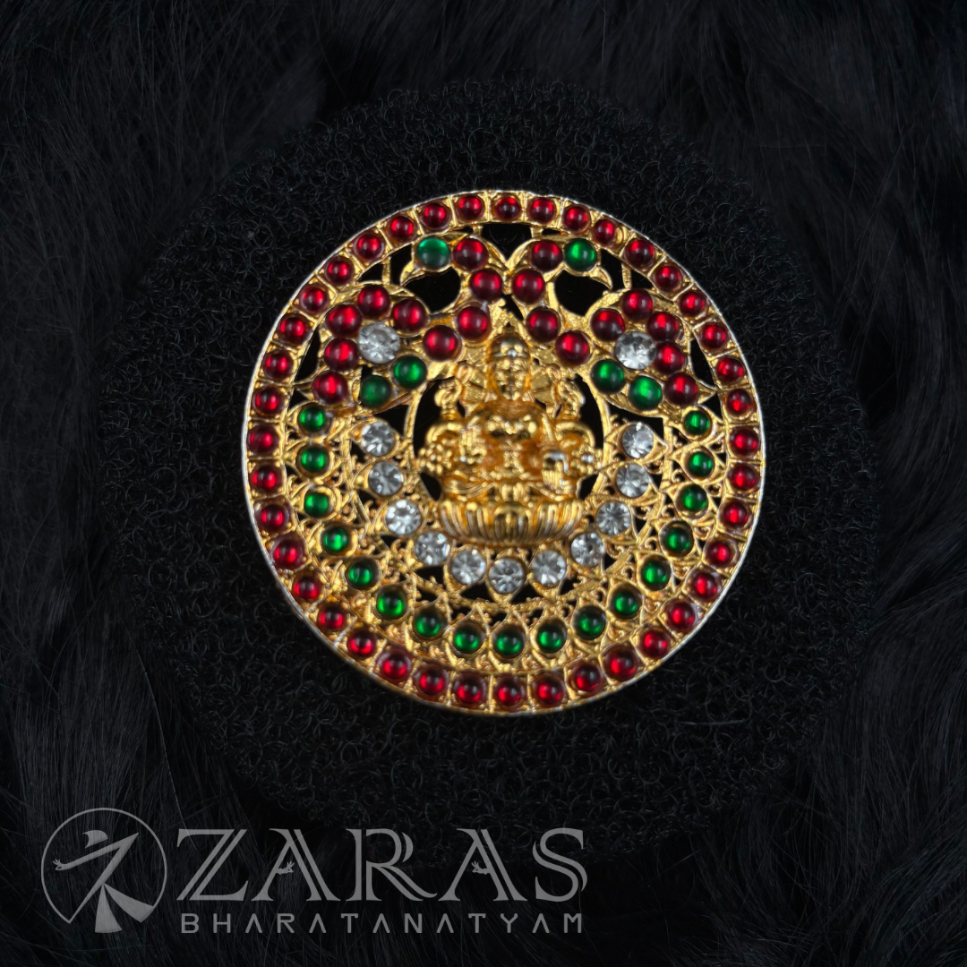 A rakodi is a hair ornament worn by female Bharatanatyam dancers. The rakodi is positioned above a hair ring that is used to secure all of the hair at the top. Despite being a tiny, one-piece ornament, it is just as essential as the others. Flowers are tied around the hair ring and the rakodi is placed above it, resulting in total beauty.