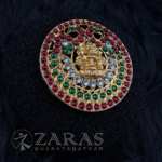 From simple elegant pieces to beautiful traditional pieces, Zaras has an absolutely stunning collection of Rakodi. The varieties include Goddess Lakshmi-inspired rakodi, layered with maroon and green kemp stones and white stones. An intricate carving of Goddess Lakshmi, sitting on the lotus, showing varada hasta and her devotees nearby, in golden foil is placed in the centre.