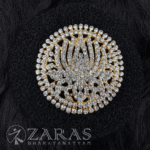From simple elegant pieces to beautiful traditional pieces, Zaras has an absolutely stunning collection of Rakodi. The varieties include Goddess Lakshmi-inspired rakodi, layered with maroon and green kemp stones and white stones. An intricate carving of Goddess Lakshmi, sitting on the lotus, showing varada hasta and her devotees nearby, in golden foil is placed in the centre.