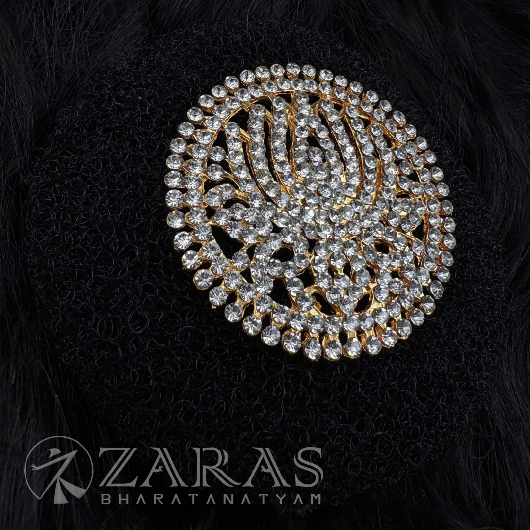 A rakodi is a hair ornament worn by female Bharatanatyam dancers. The rakodi is positioned above a hair ring that is used to secure all of the hair at the top. Despite being a tiny, one-piece ornament, it is just as essential as the others. Flowers are tied around the hair ring and the rakodi is placed above it, resulting in total beauty.