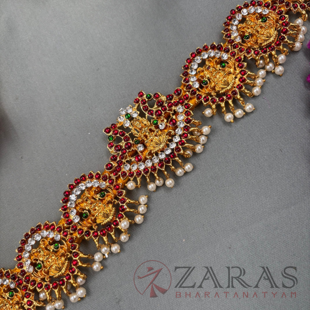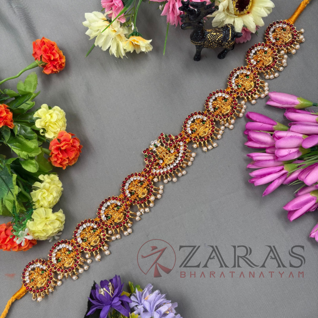 Zaras offers an exclusive collection of Ottiyanams. Kemp Ottiyanams are made with green and maroon kemp stones, white stones and pearl hangings, Ottiyanams are designed with pure white stones as well as coloured stones with intricate designs, Gold plated ottiyanams which are perfect for male dancers and many more unique designs are available. The length is designed accordingly and is suitable for all age groups, also can be adjusted according to the waist size.
