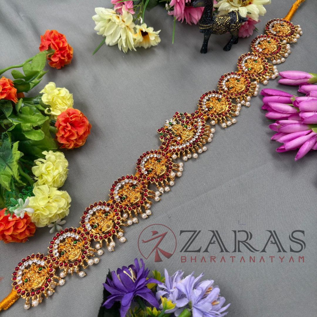 The waist chain known as Ottiyanam is a beautiful ornament worn at the waist of the dancers. It would be gold plated or with stone works. Some intricate designs or sculptures of the god would be carved in the middle of it. Ottiyanam or hip belts make the hip and waist movements more visible.