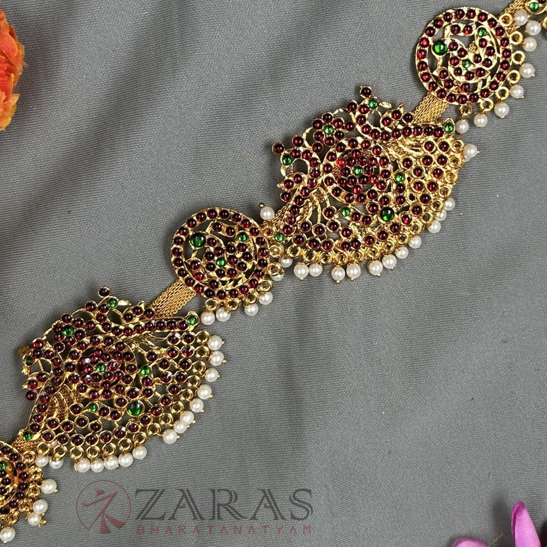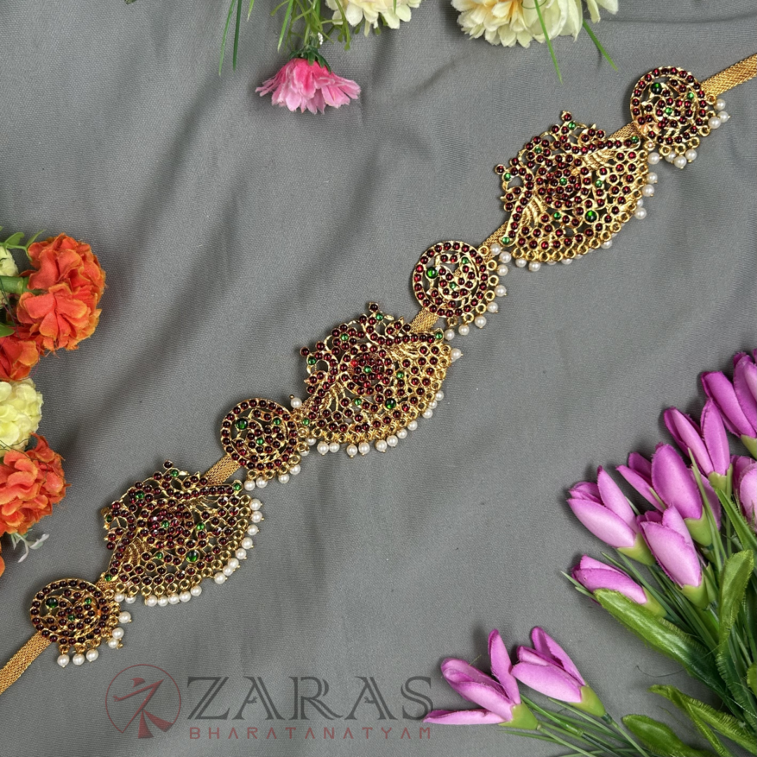 Zaras offers an exclusive collection of Ottiyanams. Kemp Ottiyanams are made with green and maroon kemp stones, white stones and pearl hangings, Ottiyanams are designed with pure white stones as well as coloured stones with intricate designs, Gold plated ottiyanams which are perfect for male dancers and many more unique designs are available. The length is designed accordingly and is suitable for all age groups, also can be adjusted according to the waist size.